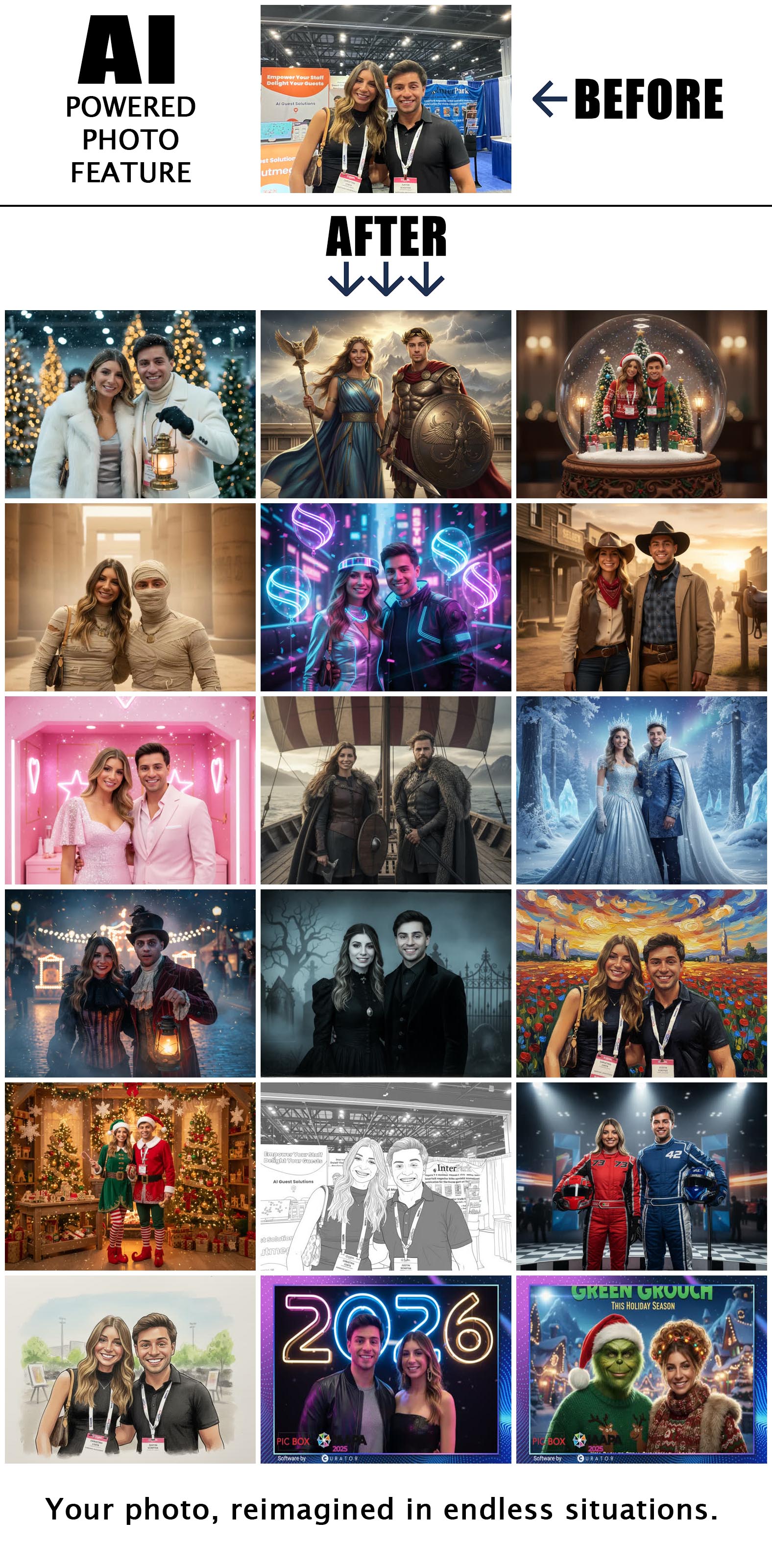 AI Powered Photo Feature: Use the power of AI to reimagine your photos in endless situations, backgrounds, outfits, fantasy settings, and more! (can be included for an additional/nominal fee)
